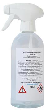 Händedesinfektionsmittel 70% vol Gebrauchsfertig, in 500ml Pet Sprühflasche rund Gefahrenhinweis: leicht entzündbar