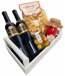 Vigoroso Set: 2 Fl. 50cl Vigoroso, 500g Fusilli, 350g Tomatensugo Mamma Mia, 300g Oliven mit Peperoni, verpackt in schönem Holzkistli mit Cellophan