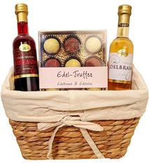 Edles im Korb: 100g Edel-Truffes (9 Stück), 1 Fl. 10cl Edelsüss, 1 Fl. 10cl Edelbrand, schön verpackt im Korb mit Cellophan